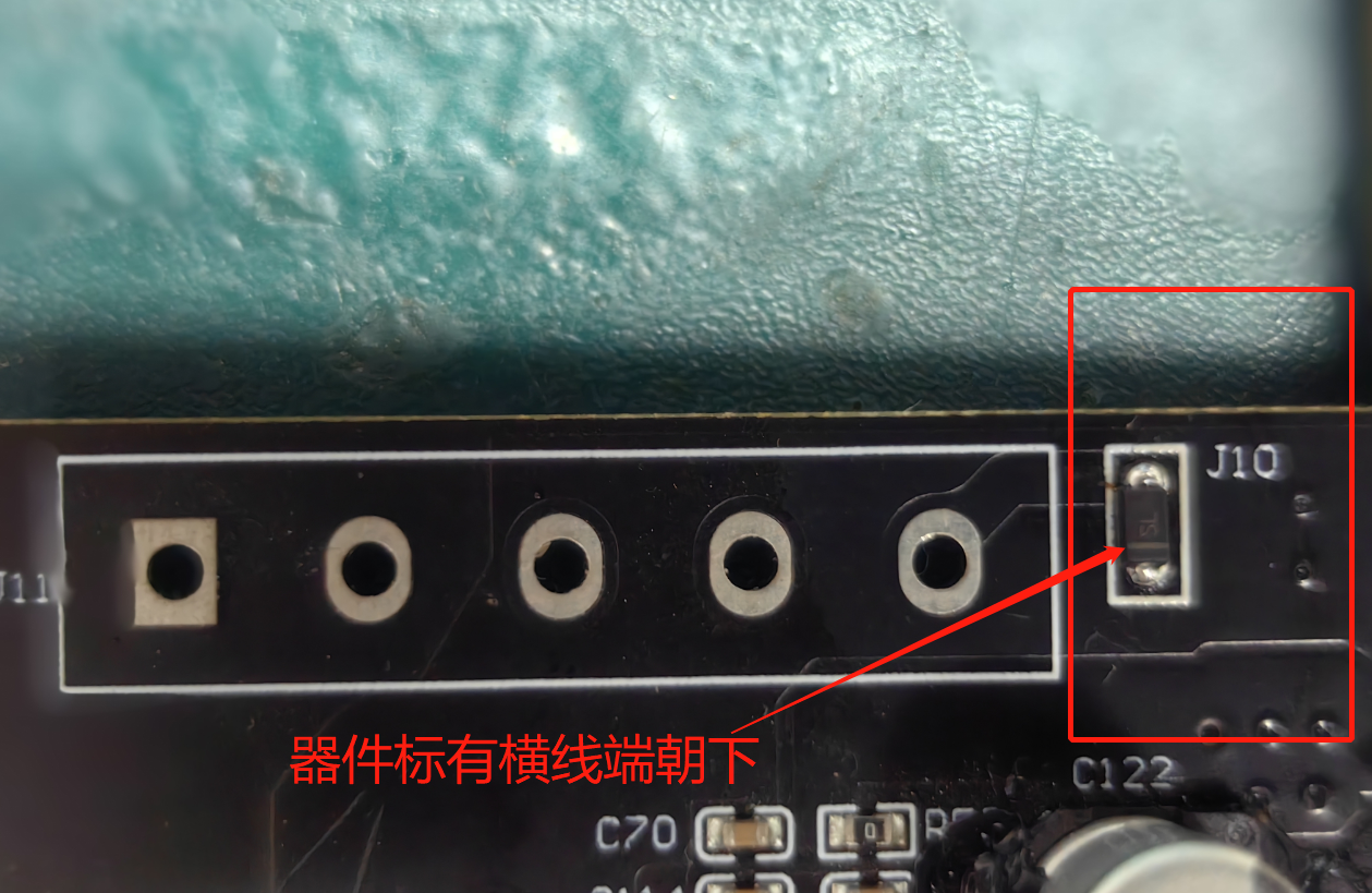 2、用電烙鐵將器件1N5819焊接到J10位置,注意:1N5819是有方向的,器件上標(biāo)有橫線的那頭朝下,如圖-2所示,不可焊反否則將燒壞器件。